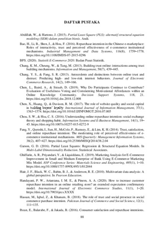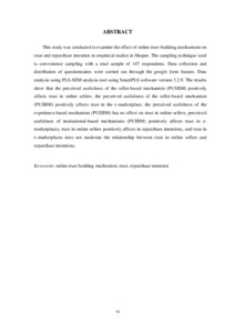is convenience sampling with a total sample of 147 respondents. Data collection and distribution of questionnaires were carried out through the google form feature. Data analysis using PLS-SEM analysis tool using SmartPLS software version 3.2.9. The results show that the perceived usefulness of the seller-based mechanism (PUSBM) positively affects trust in online sellers, the perceived usefulness of the seller-based mechanism (PUSBM) positively affects trust in the e-marketplace, the perceived usefulness of the experience-based mechanism (PUEBM) has no effect on trust in online sellers, perceived usefulness of institutional-based mechanisms (PUIBM) positively affects trust in emarketplaces, trust in online sellers positively affects in repurchase intentions, and trust in e-marketplaces does not moderate the relationship between trust in online sellers and repurchase intentions.