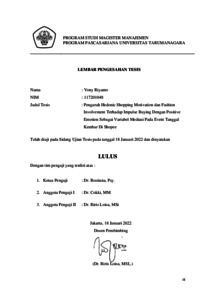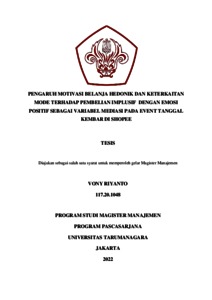 Riyanto, Vony (2021) PENGARUH HEDONIC SHOPPING MOTIVATION DAN FASHION INVOLVEMENT TERHADAP IMPULSE BUYING DENGAN POSITIVE EMOTION SEBAGAI VARIABEL MEDIASI PADA EVENT TANGGAL KEMBAR DI SHOPEE. Masters thesis, Universitas Tarumanagara.
