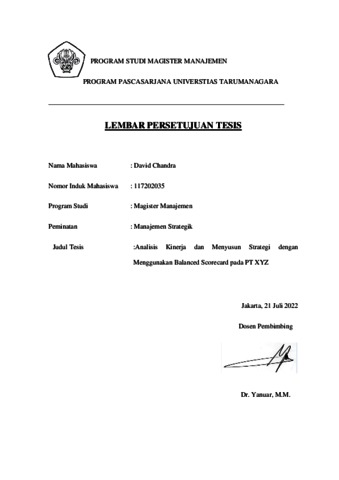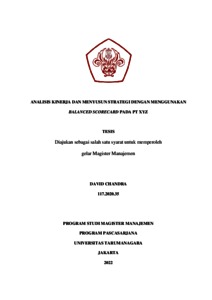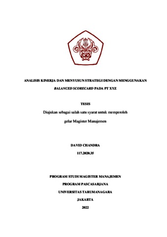 CHANDRA, DAVID (2021) ANALISIS KINERJA DAN MENYUSUN STRATEGI DENGAN MENGGUNAKAN BALANCED SCORECARD PADA PT XYZ. Masters thesis, Universitas Tarumanagara.