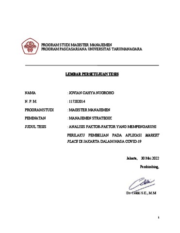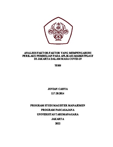 CAHYA, JOVIAN (2021) ANALISIS FAKTOR-FAKTOR YANG MEMPENGARUHI PERILAKU PEMBELIAN PADA APLIKASI MARKETPLACE DI JAKARTA DALAM MASA COVID-19. Masters thesis, Universitas Tarumanagara.
