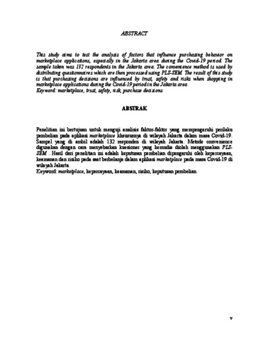 This study aims to test the analysis of factors that influence purchasing behavior on marketplace applications, especially in the Jakarta area during the Covid-19 period. The sample taken was 132 respondents in the Jakarta area. The convenience method is used by distributing questionnaires which are then processed using PLS-SEM. The result of this study is that purchasing decisions are influenced by trust, safety and risks when shopping in