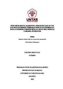 DESTYANA, YOLINDA (2021) PENGARUH DIGITAL MARKETING, PERCEIVED EASE OF USE DAN RAGAM PRODUK TERHADAP KEPUTUSAN PEMBELIAN PADA E-COMMERCE SHOPEE DENGAN MINAT BELI SEBAGAI VARIABEL INTERVENSI. Masters thesis, Universitas Tarumanagara.