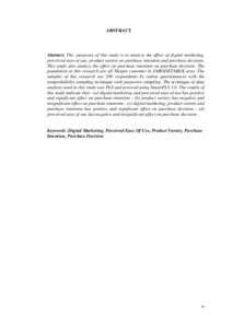 nonprobability sampling technique with purposive sampling. The technique of data analysis used in this study was PLS and proceed using SmartPLS 3.0. The results of this study indicate that : (a) digital marketing and perceived ease of use has positive and significant effect on purchase intention ; (b) product variety has negative and insignificant effect on purchase intention ; (c) digital marketing, product variety and purchase intention has positive and significant effect on purchase decision ; (d)