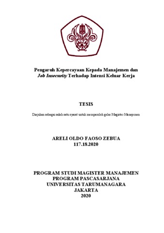 ZEBUA, ARELI OLDO FAOSO (2020) PENGARUH KEPERCAYAAN TERHADAP MANAJEMEN DAN RASA TIDAK AMAN DALAM BEKERJA TERHADAP INTENSI KELUAR KERJA. Masters thesis, Universitas Tarumanagara.