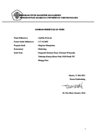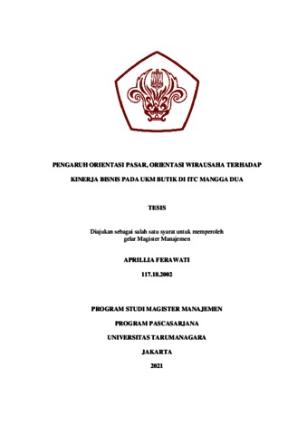 FERAWATI, APRILLIA (2020) PENGARUH ORIENTASI PASAR, ORIENTASI WIRAUSAHA TERHADAP KINERJA BISNIS PADA UKM BUTIK DI ITC MANGGA DUA. Masters thesis, Universitas Tarumanagara.