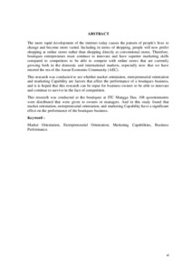 This research was conducted at the boutiques at ITC Mangga Dua. 108 questionnaires were distributed that were given to owners or managers. And in this study found that market orientation, entrepreneurial orientation, and marketing Capability have a significant effect on the performance of the boutiques business.