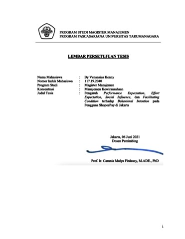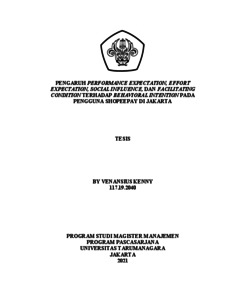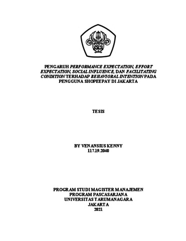 KENNY, BY VENANSIUS (2020) PENGARUH PERFORMANCE EXPECTATION, EFFORT EXPECTATION, SOCIAL INFLUENCE, DAN FACILITATING CONDITION TERHADAP BEHAVIORAL INTENTION PADA PENGGUNA SHOPEEPAY DI JAKARTA. Masters thesis, Universitas Tarumanagara.