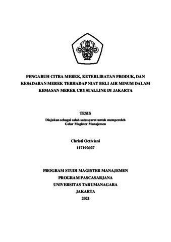 OCTIVIANI, CHRISTI (2020) PENGARUH CITRA MEREK, KETERLIBATAN PRODUK, DAN KESADARAN MEREK TERHADAP NIAT BELI AIR MINUM DALAM KEMASAN MEREK CRYSTALLINE DI JAKARTA. Masters thesis, Universitas Tarumanagara.
