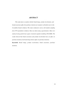 This study aims to examine whether brand image, product involvement, and brand awareness affect the purchase intention of consumers of bottled water in the Crystalline brand in Jakarta. This study conducted a survey with random sampling from 279 respondents in Jakarta. Data was taken using a questionnaire. Data were analyzed using partial least square structural equation modeling (PLS-SEM). The