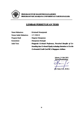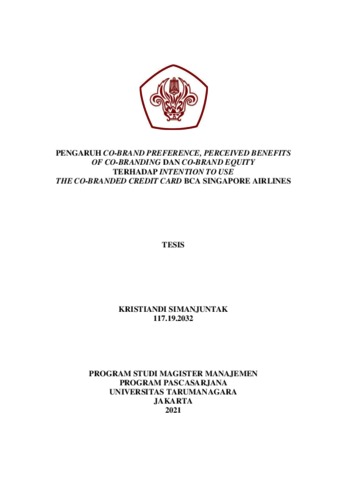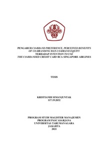 SIMANJUNTAK, KRISTIANDI (2020) PENGARUH CO-BRAND PREFERENCE, PERCEIVED BENEFITS OF CO-BRANDING DAN CO-BRAND EQUITY TERHADAP INTENTION TO USE THE CO-BRANDED CREDIT CARD BCA SINGAPORE AIRLINES. Masters thesis, Universitas Tarumanagara.