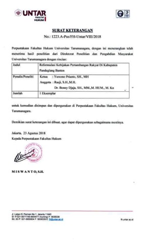 Yuwono Prianto, Penulis 1 and Rasji, Penulis 2 and Benny Djaja, Penulis 3 Reformulasi Kebijakan Pertambangan Rakyat Di Kabupaten Pandeglang Banten. Reformulasi Kebijakan Pertambangan Rakyat Di Kabupaten Pandeglang Banten.