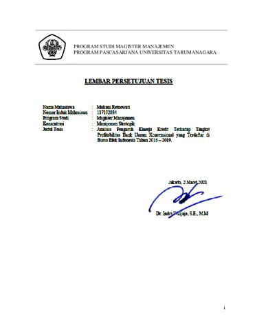 RETNOWATI, MULIANI (2020) ANALISIS PENGARUH KINERJA KREDIT TERHADAP TINGKAT PROFITABILITAS BANK UMUM KONVENSIONAL YANG TERDAFTAR DI BURSA EFEK INDONESIA TAHUN 2016 - 2019. Masters thesis, Universitas Tarumanagara.