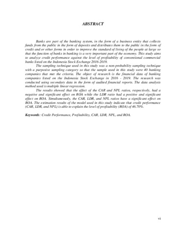 | Uncontrolled Keywords: | Credit Performance, Profitability, CAR, LDR, NPL, and ROA |