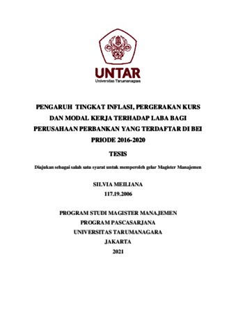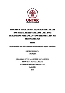 MEILIANA, SILVIA (2020) PENGARUH TINGKAT INFLASI, PERGERAKAN KURS DAN MODAL KERJA TERHADAP LABA BAGI PERUSAHAAN PERBANKAN YANG TERDAFTAR DI BEI PRIODE 2016-2020. Masters thesis, Universitas Tarumanagara.