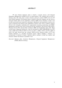 PT Asia Chemie Indonusa plans to build a cosmetic factory with Original Equipment Manufacturer (OEM) service as main business. The company does not have a business plan. The study aims to make a business plan for cosmetic OEM service for PT Asia Chemie Indonusa. The business plan is needed so that this company can run, survive and gain market share in the competitive cosmetic OEM services business so that it can provide good profit and competitive advantages. Qualitative and quantitative analyzes are used in analyzing this business plan. Qualitative analysis tools such as industry analysis (Porter's five strengths), marketing mix, segmentation, targeting, positioning, and SWOT. Quantitative analysis tools such as projected income statements, Net Present Value (NPV), Payback Period (PP), Internal Rate of Return (IRR) and Profitability Index (PI). When viewed from a financial perspective, with an investment of IDR 3,000,000,000, the NPV value is IDR 15,613,709,317 (NPV> 0), PI is 6.2 (PI> 1), IRR is 74.8%, and PP is IDR 2.4 years, the study showed that the cosmetic OEM services business project of PT Asia Chemie Indonusa is a feasible investment project. Before building a business, an entrepreneur is advised to make a business plan in advance to find out, analyze and measure whether the business is feasible or not.