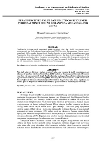 miharni, dokumen (2019) Peran perceived value health conscousness terhadap minat beli mi instan pada mahasiswa FEB Untar. Peran perceived value health conscousness terhadap minat beli mi instan pada mahasiswa FEB Untar. ISSN 2541-3406 / 2541-285X