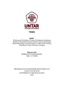 Sukmaningsih, Febrianti (2022) Pelaksanaan Pendaftaran Tanah Di Kabupaten Kepulauan Mentawai Menurut Peraturan Menteri Agraria Dan Kepala Badan Pertanahan Nasional Nomor 6 Tahun 2018 Tentang Pendaftaran Tanah Sistematis Lengkap. Masters thesis, Universitas Tarumanagara.