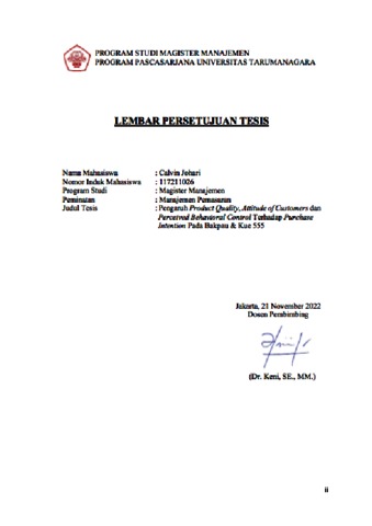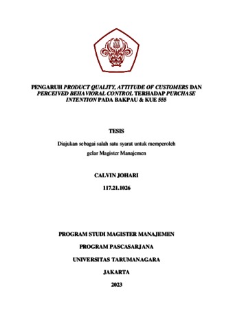 JOHARI, CALVIN (2022) PENGARUH PRODUCT QUALITY, ATTITUDE OF CUSTOMERS DAN PERCEIVED BEHAVIORAL CONTROL TERHADAP PURCHASE INTENTION PADA BAKPAU & KUE 555. Masters thesis, Universitas Tarumanagara.