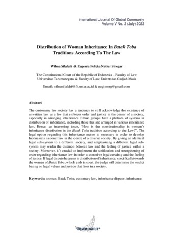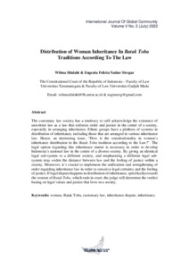 Silalahi, Wilma and Siregar, Eugenia Felicia Natiur (2022) Distribution of Woman Inheritance In Batak Toba Traditions According To The Law. International Journal Of Global Community, V (2).