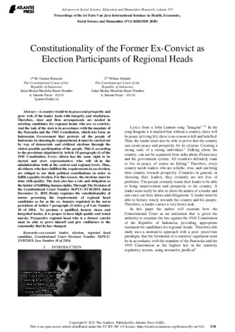 Hamzah, M. Guntur and Silalahi, Wilma (2020) Constitutionality of the Former Ex-Convict as Election Participants of Regional Heads. Proceedings of the 1st Paris Van Java International Seminar on Health, Economics, Social Science and Humanities (PVJ-ISHESSH 2020), 534. ISSN 978-94-6239-349-3