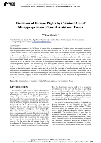 Silalahi, Wilma (2021) Violations of Human Rights by Criminal Acts of Misappropriation of Social Assistance Funds. Proceedings of the 2nd International Conference on Law and Human Rights (ICLHR 2021). ISSN 2352-5398