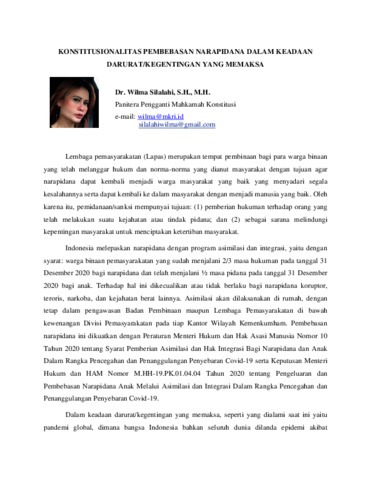 Silalahi, Wilma (2020) Konstitusionalitas Pembebasan Narapidana Dalam Keadaan Darurat/Kegentingan Yang Memaksa. Majalah Konstitusi. ISSN 18297692