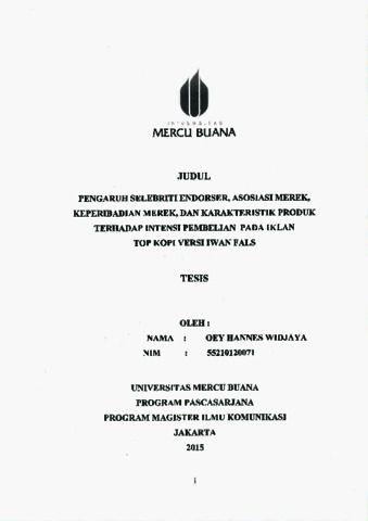 Oey Hannes Wijaya, Tesis (2015) Pengaruh Selebriti endorser, asosiasi merek kepribadian merek dan karakteristik produk terhadap intensi pembelian pada iklan top kopi versi iwan fals. Masters thesis, Universitas Tarumanagara.