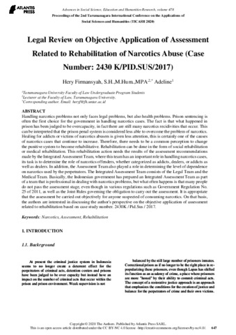 Firmansyah, Hery and Adeline, Adeline (2020) Legal Review on Objective Application of Assessment Related to Rehabilitation of Narcotics Abuse (Case Number: 2430 K/PID.SUS/2017). Proceedings of the 2nd Tarumanagara International Conference on the Applications of Social Sciences and Humanities (TICASH 2020).