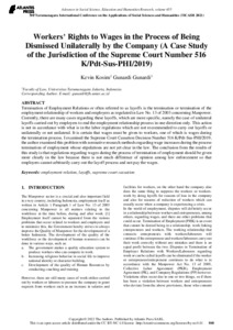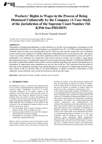 Kevin Kosim, Penulis Pertama and Gunardi Gunardi, Penulis Kedua Workers’ Rights to Wages in the Process of Being Dismissed Unilaterally by the Company (A Case Study of the Jurisdiction of the Supreme Court Number 516 K/Pdt-Sus-PHI/2019). Workers’ Rights to Wages in the Process of Being Dismissed Unilaterally by the Company (A Case Study of the Jurisdiction of the Supreme Court Number 516 K/Pdt-Sus-PHI/2019).
