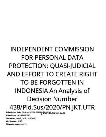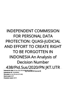 Gunardi, Gunardi and Redi, Ahmad and Ramadhan, Dylan Aldianza (2022) Turnitin : Independent Commission For Personal Data Protection: Quasi-Judicial And Effort To Create Right To Be Forgotten In Indonesia An Analysis of Decision Number 438/Pid.Sus/2020/PN JKT.UTR. Jurnal Yudisial.