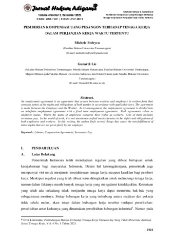 Fedryca, Michele and Gunardi, Lie (2021) Pemberian Kompensasi Uang Pesangon Terhadap Tenaga Kerja Dalam Perjanjian Kerja Waktu Tertentu. Jurnal Hukum Adigama, 4 (2). ISSN E: 2655-7347, P: 2747-0873