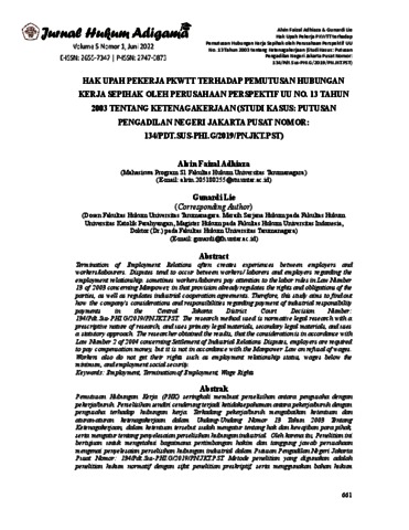 Adhiaza, Alvin Faizal and Gunardi, Lie (2022) HAK UPAH PEKERJA PKWTT TERHADAP PEMUTUSAN HUBUNGAN KERJA SEPIHAK OLEH PERUSAHAAN PERSPEKTIF UU NO. 13 TAHUN 2003 TENTANG KETENAGAKERJAAN (STUDI KASUS: PUTUSAN PENGADILAN NEGERI JAKARTA PUSAT NOMOR: 134/PDT.SUS-PHI.G/2019/PN.JKT.PST). Jurnal Hukum Adigama, 5 (1). ISSN E: 2655-7347, P: 2747-0873