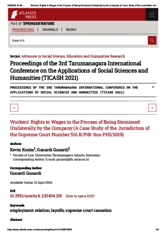 Gunardi, Gunardi Workers’ Rights to Wages in the Process of Being Dismissed Unilaterally by the Company (A Case Study of the Jurisdiction of the Supreme Court Number 516 K/Pdt-Sus-PHI/2019). Proceedings of the 3rd Tarumanagara International Conference on the Applications of Social Sciences and Humanities (TICASH 2021). ISSN 2352-5398