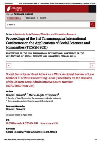 Gunardi, Gunardi Social Security on Heart Attack as a Work Accident Review of Law Number 13 of 2003 Concerning Labor (Case Study on the Decision of the Jakarta State Administrative Court: Number 169/G/2019/Ptun-Jkt). Proceedings of the 3rd Tarumanagara International Conference on the Applications of Social Sciences and Humanities (TICASH 2021).