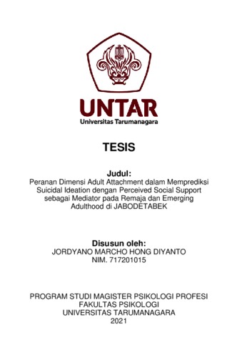 Diyanto, Jordyano Marcho Hong (2023) Peranan Dimensi Adult Attachment dalam Memprediksi Suicidal Ideation dengan Perceived Social Support sebagai Mediator pada Remaja dan Emerging Adulthood di JABODETABEK. Masters thesis, Universitas Tarumanagara.