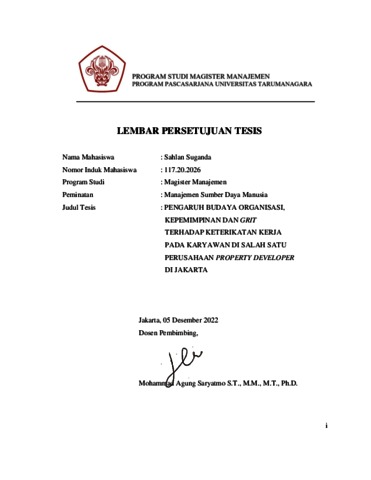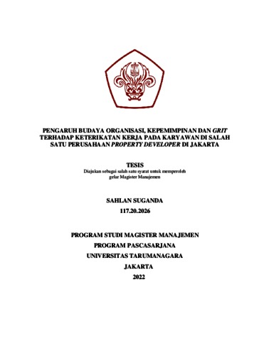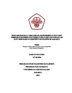 SUGANDA, SAHLAN (2022) PENGARUH BUDAYA ORGANISASI, KEPEMIMPINAN DAN GRIT TERHADAP KETERIKATAN KERJA PADA KARYAWAN DI SALAH SATU PERUSAHAAN PROPERTY DEVELOPER DI JAKARTA. Masters thesis, Universitas Tarumanagara.