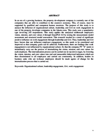 In an era of a growing business, the property development company is currently one of the companies that are able to contribute to the country's economy. This, of course, must be supported by qualified and competent human resources. The purpose of this study is to analyze the influence of organizational culture, leadership, and Grit on work engagement in one of the property developer companies in the Jakarta area. This study uses a quantitative type involving 245 respondents. This study applies the analytical methoeach employee's vision, mission, and core values d through SmartPLS 4.0 by testing the measurement model assessment and structural model assessment. This research resulted in a trend of significant positive influence on work engagement through leadership and Grit. Thus, leadership and Grit have factors that can influence employee engagement, so this needs to be considered and improved so that company goals can be achieved. Furthermore, there are findings that work