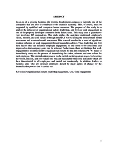 engagement is not influenced by organizational culture. So that the company PT "X" needs to immediately carry out the process of internalizing the vision, mission, and core values for each employee. The internalization process can be carried out in top-down stages, by lowering the vision, mission, and core values into real and measurable behavioral indicators which are then disseminated to all employees and carried out consistently. In addition, leaders in business units who are in-house employees should be made agents of change for the internalization process that is carried out.