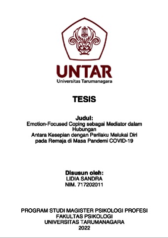 Sandra, Lidia (2023) Emotion-Focused Coping sebagai Mediator dalam Hubungan Antara Kesepian dengan Perilaku Melukai Diri pada Remaja di Masa Pandemi COVID-19. Masters thesis, Universitas Tarumanagara.