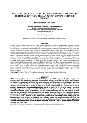 non-probability method toward 162 respondents who have used mobile banking. The data were analyzed by using PLS-SEM and revealed that perceived ease of use and relative advantage positively and significantly influence attitude towards the application, while trust is mediating the influences. The results expected to adding references for researchers and the financial sector’s practitioners, particularly in stimulating business strategy from the management in setting strategy to stimulating users' attitudes towards the digital application. Moreover, the mediating role of trust implied that the benefit and ease are based on customers’ trust toward the application. Customers won’t have positive attitude toward the application if they don’t trust it, eventhough it offers relative advantage and is easy to use.