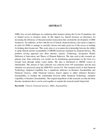 for helping their businesses. This study aims to re-examine the relationship between the ability to adopt fintech and the sustainability of MSME businesses mediated by financial literacy. The problem solving approach uses three theories, namely: Technology Acceptance Model, Diffusion of Innovation, and Theory of Planned Behavior. The data used in this research are primary data. Data collection was carried out by distributing questionnaires in the form of a Google form through online social media. The data is distributed to MSME owners in Jabodetabek. The amount of data collected was collected from 149 respondents and the data obtained was processed using the SEM-PLS version 4.0. The research results is that Financial Technology Adoption Capability has a significant influence on Business Sustainability and Financial Literacy, while Financial Literacy doesn't appear to either influence Business Sustainability or mediate the relationship between either Financial Technology Adoption