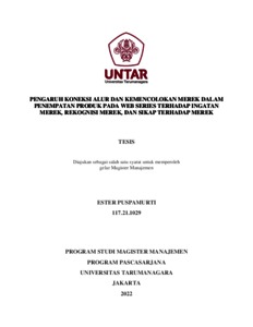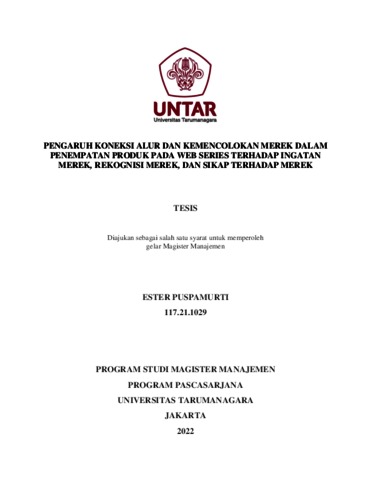 PUSPAMURTI, ESTER (2022) PENGARUH KONEKSI ALUR DAN KEMENCOLOKAN MEREK DALAM PENEMPATAN PRODUK PADA WEB SERIES TERHADAP INGATAN MEREK, REKOGNISI MEREK, DAN SIKAP TERHADAP MEREK. Masters thesis, Universitas Tarumanagara.