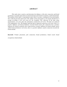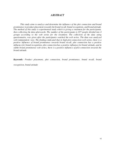 This study aims to analyze and determine the influence of the plot connection and brand prominence in product placement towards the brand recall, brand recognition, and brand attitude. The method of this study is experimental study which is giving a treatment for the participants, then collecting the data afterwards. The number of the participants is 227 people divided into 4 groups according to the web series for the treatment. The collection of the data using questionnaire, was given after the participants watched the web series. The data was analyzed with independent t-test. The findings indicated that in high plot connection web series, there is a positive influence of brand prominence towards brand recall, plot connection has a positive influence for brand recognition, plot connection has a positive influence for brand attitude, and in subtle brand prominence web series, there is a positive influence of plot connection towards the brand attitude.