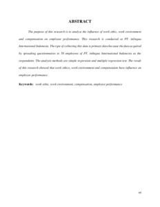 International Indonesia. The type of collecting this data is primary data because the data acquired by spreading questionnaires to 50 employees of PT. inlingua International Indonesia as the respondents. The analysis methods are simple regression and multiple regression test. The result of this research showed that work ethics, work environment and compenstaion have influence on employee performance.
