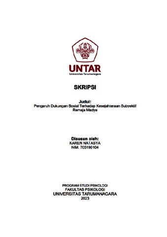 Natasya, Karen (2023) Pengaruh Dukungan Sosial Terhadap Kesejahteraan Subjektif Remaja Madya. Skripsi thesis, Universitas Tarumanagara.