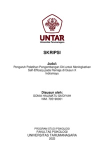 Sa’diyah, Sonia Halimatu (2023) Pengaruh Pelatihan Pengembangan Diri untuk Meningkatkan Self-Efficacy pada Remaja di Dusun X Indramayu. Skripsi thesis, Universitas Tarumanagara.