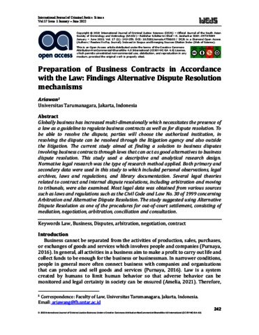 Ariawan, Ariawan (2022) Preparation of Business Contracts in Accordance with the Law : Findings Alternative Dispute Resolution mechanisms. International Journal of Criminal Justice Science, 17 (1).