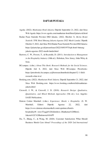 Manhattan Hotel Jakarta merupakan salah satu city hotel yang berlokasi di Kuningan, Jakarta Selatan. Berdasarkan ulasan pada situs web Traveloka, Booking.com, dan Agoda (dipetik 20 September 2022), aspek akustik, pencahayaan, furnitur, fasilitas, dan dekorasi pada interior Manhattan Hotel Jakarta masih dapat diubah dan diperbarui. Tujuan dari perancangan ini adalah untuk merancang utilitas hotel yang lebih memadai serta menerapkan gaya desain yang lebih modern dan sesuai dengan citra Manhattan Hotel Jakarta. Metode yang digunakan pada perancangan ini adalah metode kualitatif dengan batas studi pustaka, studi lapangan, dan studi desain. Metode desain yang digunakan dalam perancangan konsep programatik dan konsep desain ini berdasar dari proses analisis dan sintesis desain 8 tahap yang disampaikan oleh Rosemary Kilmer dan W. Otie Kilmer. Konsep tema yang diterapkan pada perancangan interior Manhattan Hotel Jakarta adalah crown city dengan gaya kontemporer. Pemilihan tema crown city dengan gaya kontemporer bertujuan untuk menunjukkan citra elegan dan mewah pada interior Manhattan Hotel Jakarta. Tema tersebut dipadukan dengan citra Manhattan Hotel Jakarta melalui penggunaan palet warna dan konsep bentuk terpilih. Konsep tersebut akan menciptakan nuansa desain interior yang lebih berkesan bagi pengunjung masa kini, serta dapat mengakomodasi kebutuhan dan kenyamanan para pengunjung hotel. Kata Kunci: City Hotel; Desain Interior; Kontemporer; Perancangan
