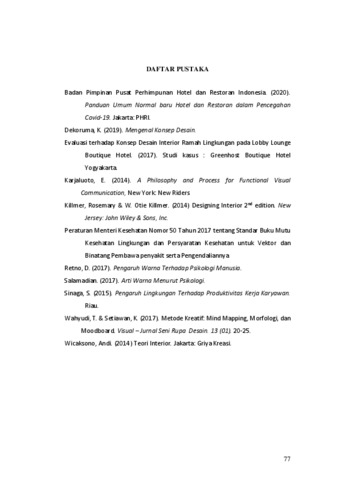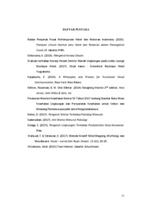 Hotel merupakan salah satu bentuk akomodasi yang dikelola secara komersial, yang disediakan bagi setiap orang untuk memperoleh pelayanan atau penginapan berikut dengan makanan dan minuman. Namun, sayangnya, 2 tahun lalu dunia diserang satu virus yang bernama Coronavirus atau Covid-19 dan telah merugikan hampir seluruh belahan dunia dan 7 dari 10 orang meninggal karena virus tersebut. Salah satu bidang pekerjaan yang paling dirugikan adalah perhotelan. Banyak ketentuan yang telah berubah dari pandemic tersebut salah satunya adalah protocol kesehatan yang masih diterapkan hingga saat ini. Mengangkat tema “Perancangan Interior Hotel Artotel, di Jakarta” yang kaya akan seni dari para seniman untuk dituang ke dalam desain pada era Covid-19 ini. Para pengelola dan desainer mancari solusi dalam hal desain mengenai pandemic dan berusaha menemukan cara dan membuat terobosan baru dengan serangkaian penyesuaian yang perlu dilakukan. Tujuannya adalah agar hotel dapat beroperasi secara normal dengan ketentuan terbaru. Kata Kunci: Art, Artotel, Hotel, Hospitality, Interior