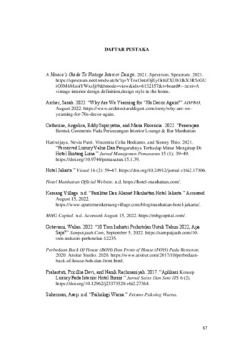 Pariwisata merupakan salah satu sektor ekonomi yang terus berkembang di Indonesia. Berkembangnya sektor pariwisata di Indonesia turut peningkatkan minat pada industri perhotelan. Dari tahun ke tahun, hotel bintang lima di Indonesia terus mengalami yang signifikan, terutama industri perhotelan yang luxury. Permasalahan yang dibahas dari perancangan ini adalah: (1) Bagaimana mendesain interior Hotel Manhattan Kuningan yang dapat mencerminkan citra atau image Hotel Manhattan? (2) Bagaimana mendesain interior Hotel Manhattan Kuningan yang informatif dan memberi kenyamanan serta suasana yang berbeda dari hotel-hotel lain? (3) Bagaimana mendesain interior Hotel Manhattan Kuningan agar memiliki identitas dan karakteristik yang khas dan berbeda sehingga memberi kesan yang kuat kepada pengunjung dan menarik minat pengunjung untuk kembali lagi? (4) Bagaimana mendesain interior Hotel Manhattan Kuningan agar sesuai dengan tren interior masa kini? (5) Bagaimana mendesain interior Hotel Manhattan Kuningan agar sesuai dengan perceived luxury value?. Metode yang digunakan dalam perancangan merupakan metode Rosemary Kilmer tahun 2014, yang mana disebutkan bahwa proses desain dibagi menjadi dua yaitu, “Analisa” yang masuk dalam kategori programming dan “Sintesa” yang merupakan langkah designing. Dari analisa yang telah dilakukan, dapat disimpulkan bahwa desain interior Hotel Manhattan Kuningan merupakan salah satu bentuk pengembangan fasilitas pelayanan akomodasi dan rekreasi bagi para pebisnis dan wisatawan di Jakarta Selatan. Dalam perancangan Hotel Manhattan Kuningan ini, digunakan konsep urban vintage dan menerapkan perceived luxury value yang diharapkan dapat menciptakan identitas dari hotel tersebut. Kata Kunci: Bar & Lounge; Desain Interior; Hotel; Lobby; Luxury; Urban Vintage